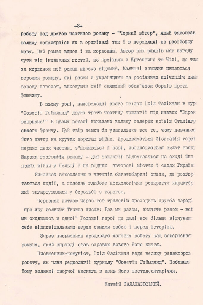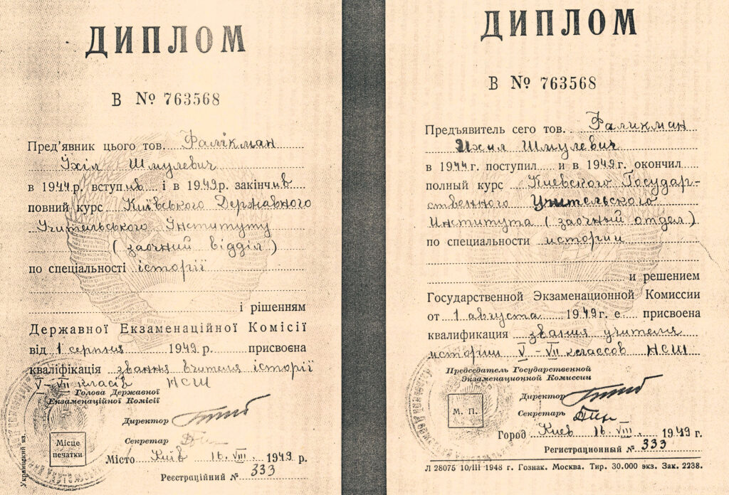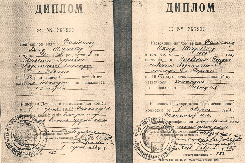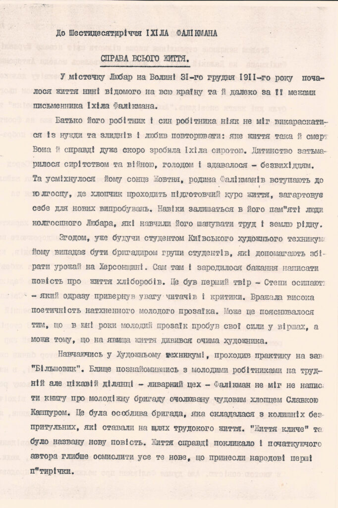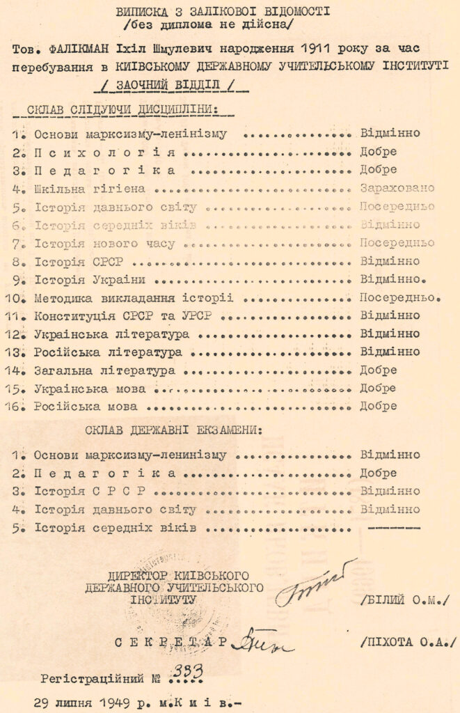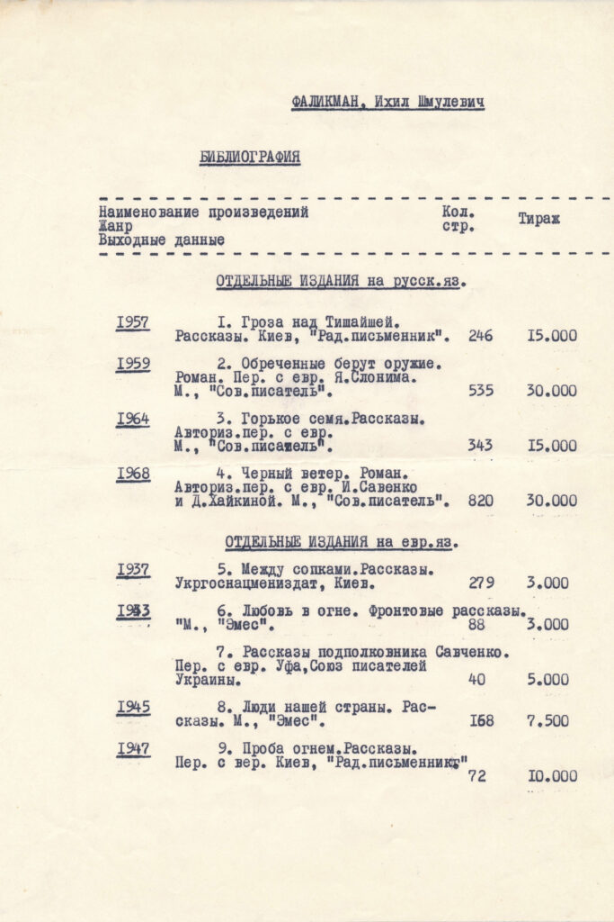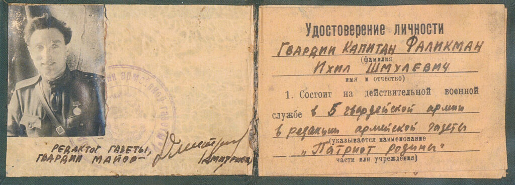Документи. Істориків та документознавців можуть зацікавити документи Іхіла Фалікмана: посвідчення особи гвардії капітана Фалікмана І. Ш. (1943), посвідчення, видане Народним комісаріатом шляхів сполучення (1945), диплом Київського державного учительського інституту (1949), трудова книжка (1950), профспілковий квиток (1961) та ін. (усього близько 20 документів за 1943–1975 рр.).