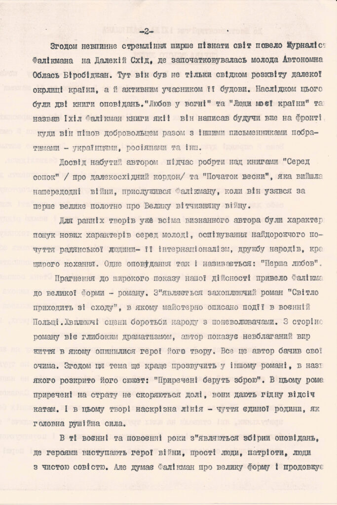 Статті та рецензії. Літературознавців можуть зацікавити літературно-критичні статті й рецензії Іхіла Фалікмана: «Молоді поети, загиблі на фронті: Аврам Бородянський, Волько Редько» (їдиш, без дати), «Про творчість А. Л. Кацева» (рос., 1973), «Про творчість Лізена А.М.» (рос., 1973) та ін. (усього 6 рукописів).