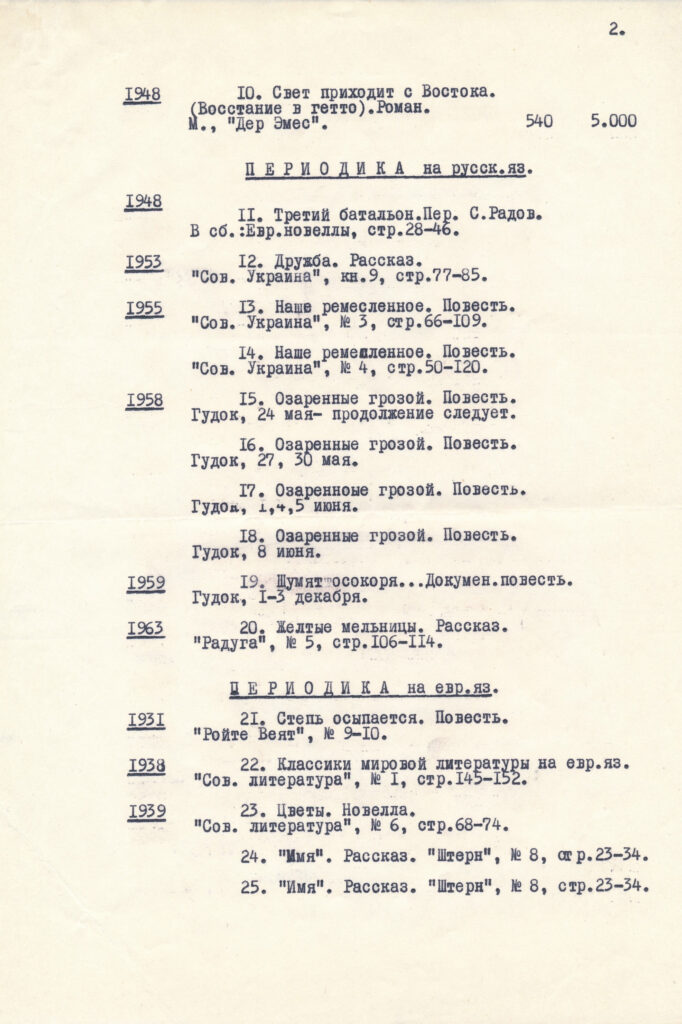 Оповідання: «Гірке полювання» (їдиш, 1966-1967), «Горпинка» (рос., укр, без дати), «Колючки» (їдиш, без дати), «Латина» (їдиш, 1972), «Ліс-красень» (їдиш, 1963), «Мамині казки» (їдиш, без дати), «Меморіальна дошка» (їдиш, без дати) та ін. (усього понад 30 оповідань, деякі твори мають кілька варіантів).