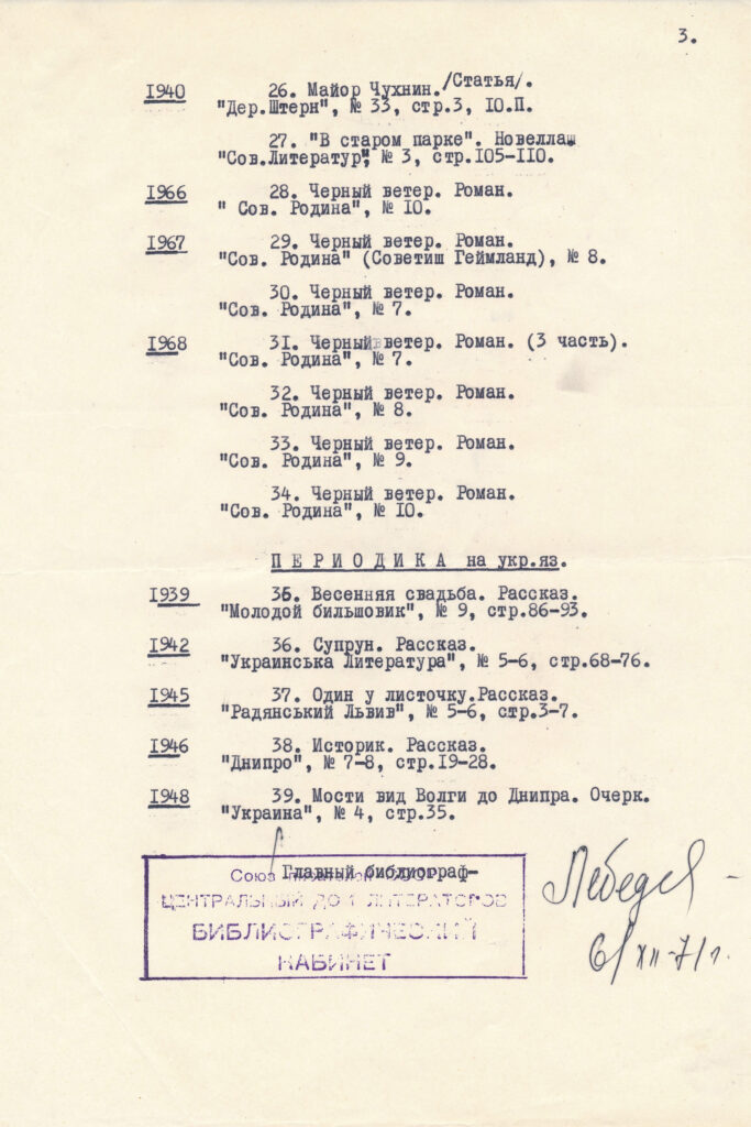 Деякі з представлених в архіві творів були надруковані за життя автора («Приречені беруть зброю», «Світло приходить зі Сходу», «Чорний вітер»). Однак, враховуючи «традиції» радянського редагування, можна припустити, що ці твори пройшли опрацювання не лише редакторами, а й цензорами. Тому було б доречно провести текстологічне дослідження авторських рукописів і порівняти їх з опублікованими текстами. Є також велика ймовірність, що частина творів, які зберігаються в архіві, не друкувалися за життя письменника.