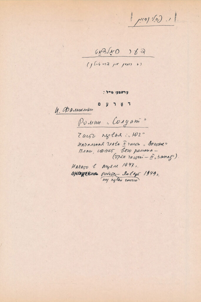 Романи: «Приречені беруть зброю» (1944–1962, їдиш, рос.), «Солдат» (без дати, їдиш), «Чорний вітер» (фрагмент, 1968, їдиш), «Світло приходить зі Сходу. Приречені беруть зброю» (їдиш, без дати), «У петербурзькій редакції» (їдиш, без дати).